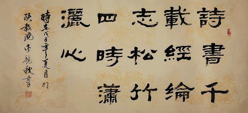 从女性角色来看,少年时她是勤学苦练、敏而好学的“三妹”,青年时她是崭露头角、芳华初绽的“三姐”,中年后她是传承书写、绵延博爱的“三娘”。少女时代的李艳秋,青涩始终伴随着苦涩,但都无法掩饰她笔下的朝气与锐气,她最开始喜欢的是魏碑,但是很快钟情于隶篆,最终把所有的热爱倾注在了隶书创作上,在对秦篆与汉简溯源之中,在对字形与书魂的心摹手追之中,李艳秋始终明确的是传统与现实之间,相互呼应的大道、正道、明道。她的确是那个执笔如舞剑的三妹,早期书作中笔墨劲健,有一种硬气与侠气,很容易令人将她和上世纪八十年代初期少林寺、木棉袈裟、侠女十三妹等电影中的侠女联系在一起,只不过是以笔为剑的“书侠”;相比较一般女性书家来讲,李艳秋较早脱颖而出从“三妹”成长为“三姐”,一方面是得到全国大展的历练,另一方面是接受市场检验,在当时接待外宾的西安友谊商店,来自全国书画家的作品在此代销,李艳秋的作品受到欢迎销路看好,书法再次改变她的人生,进入到友谊商店,成为专柜店员的同时成为对外交流的“友谊使者”。也正是始终铭记“艺多不压身”,她并没有停滞不前,而是选择了继续前进,选择到西安美院、西安交大的进修,一方面书法再造、一方面绘画拓展,技术越来越娴熟,道路越来越宽阔、艺术越来越活络,这一时期的书法创作,饱满、圆润、洒脱,陕西新生代女性书法家的书风跃然纸上。从长期实践到理论认识,李艳秋最终实现了中年突破,进入到陕西教育学院,成为一名书法教育者,在与学生的“教学相长”的过程中,李艳秋完成了自己从实践到理论的挑战,历时数年完成并出版《隶书实用章法》,将自己对隶书的热情完全倾注其中,并传播给热爱隶书的莘莘学子。师者如父亦如母,任职陕西省书协副主席并分管高校妇女儿童工作过程中,李艳秋有着“三娘”般的热情与担当,将书法教育、书法活动和慈善、公益、爱心融为一体。为此,她的奔走、呼吁、付出,往往不计得失、不计回报,人与书呈现的面貌,如风行水上,水波微漾,一波三折,线条明快,线质优美,开阔、温润、舒展,特别是现在的落款仿佛一挂艳阳下的“金柳”缀于正文之后,与文互彰,微风静美,有一种抵达之后的超越。