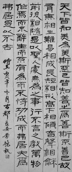 一个人最终收获的,注定是其贯穿一生的挚爱。在众多的陕西书家中,李艳秋以隶书独步、独到、独存,在一波三折、一唱三叹、走一步看三步,一步三回头的人生节奏与命运韵律里,李艳秋猎猎其风、嘤嘤其声、呦呦其鸣,是那样的荡气回肠、又是那样的百转千回。