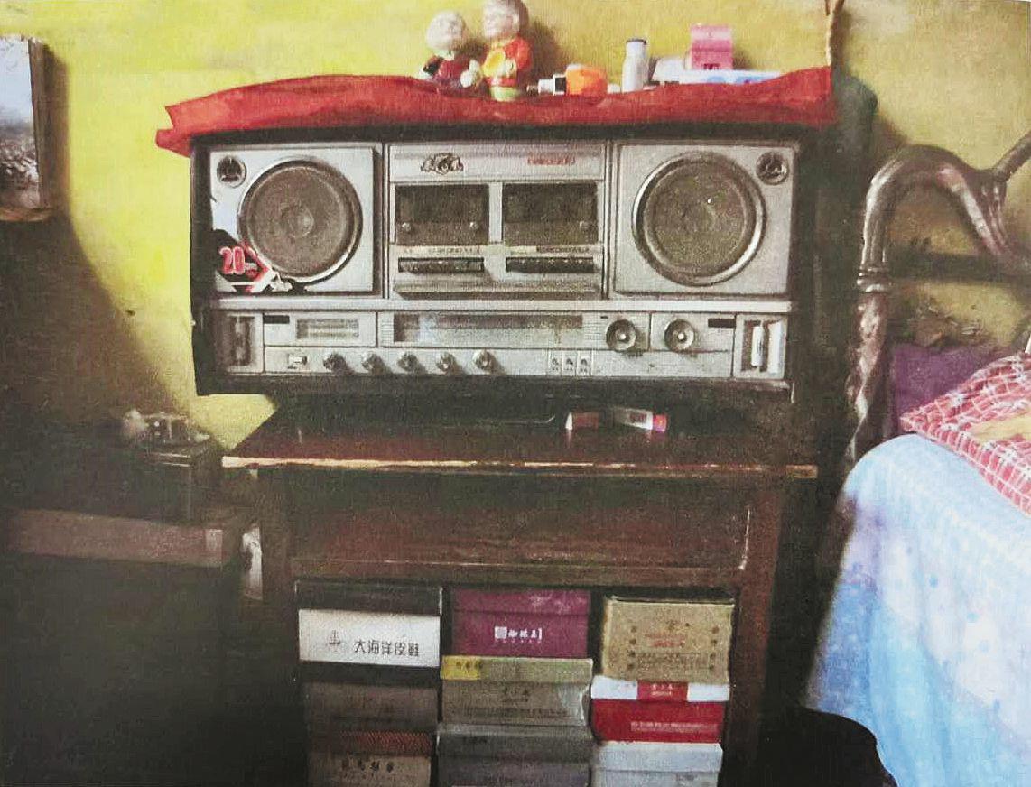 这是张富清大儿子张建国与儿媳严义芳结婚时购买的凤凰牌收录机。被儿子淘汰后,张富清拿回了家当宝贝一样收藏着,收录机上用一块防尘的红布精心地遮盖着。