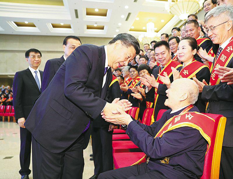2019年7月26日,在“全国模范退役军人”会上接见与会代表并合影留念时,习近平    总书记双手紧握张富清老人的手。    新华社记者  丁林摄