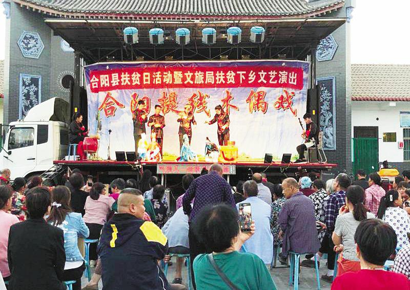 近日,渭南市合阳县文化扶贫下乡巡演活动走进合阳县路井镇路三社区,由此拉开了全县文化扶贫下乡活动的帷幕。这次活动由县文化和旅游局组织文化馆、木偶剧团、新蕾剧团三支文艺演出队伍,分别赴全县12个镇街政府所在地文化广场开展送戏下乡、送文化惠民演出活动,总体安排演出场次36场。