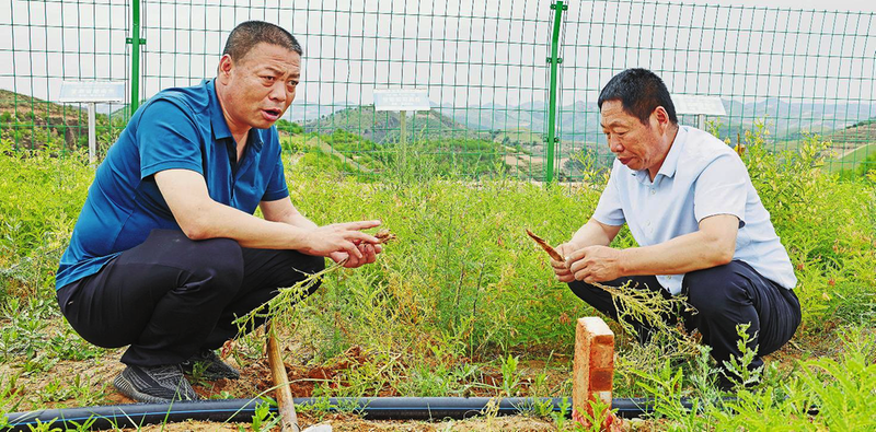 工作人员查看黄芪生长情况