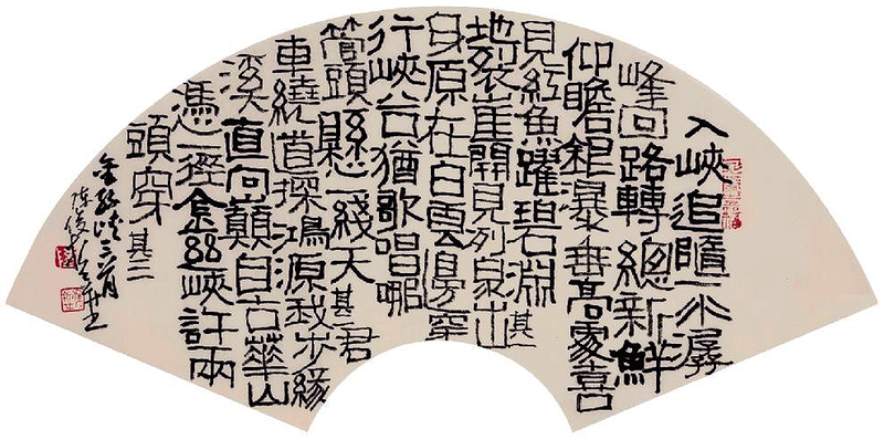 我读《三秦吟歌》,仿佛跟随着俊哲兄的步履,在三秦山水之间穿梭,乐其景致之更迭,同其欣悦于寥廓。俊哲兄的诗作,总有一种独特的大自然所造就的意境,也是他诗歌中所营造的诗境,这种意境之中,总有出人意料的奇句出来,让人眼前一亮。如他在《飞渡峡瀑布》中描写飞渡峡:“银龙滚滚出天关,素练莹莹光影间。溅玉飞珠红日里,一帘绚烂壮巴山。”滚滚动感,莹莹凝固,溅玉飞珠,绚烂画面。这本诗集与众不同的是,诗集中收有俊哲兄四十多件书法作品,真草隶篆,还有篆刻,风格各异,神采飞扬,书卷气浓郁,墨韵透纸间。我手写我诗,碑帖相融之。见心亦见字,诗字如般若。读诗之外,更见其笔墨之斑斓异彩。