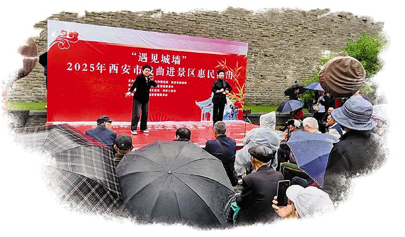同一时间,西安朝阳门环城公园内,西安三意社的惠民演出同样人气旺盛。演员们在雨中表演着《火焰驹》《周仁回府》等经典唱段,观众们或撑伞或披着雨衣,不时爆发的喝彩声,与西安城墙的青砖黛瓦共同构成一幅充满诗意的画面。