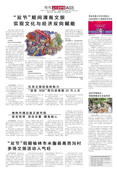 渭南市各县(市、区)因地制宜打造特色文旅IP,形成“全域开花、各具韵味”的生动格局。蒲城县举办非遗工艺美术会展,展示民俗画等传统技艺,大型情景演艺《御街夸官》巡游再现古制盛景,槐院里街区提供特色美食与文艺演出。双节期间,蒲城县接待国内游客25.25万人次,总消费达1.03亿元,游客满意度攀升。