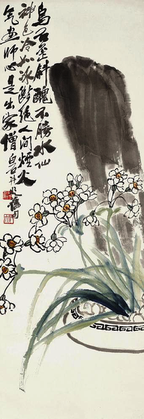 齐白石 《水仙寿石》 纸本设色 100cm×34cm 北京画院藏