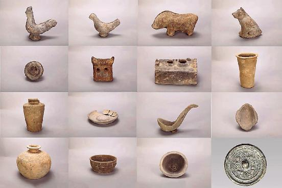 M3 为斜坡墓道土洞室墓,由墓道、封门、甬道、前室、后室五部分组成。墓室内发现人骨一具,保存状况较差,仅存盆骨及部分股骨,专家初步推断为成年男性。葬式、葬具均不详。该墓出土各类器物20件,有鸡、狗等陶俑;楼、磨盘和水井等陶模型明器;甑、耳杯、勺和钵等陶器以及1件四乳禽鸟铜镜。根据墓葬形制和出土遗物,专家初步判断其时代为西汉晚期。