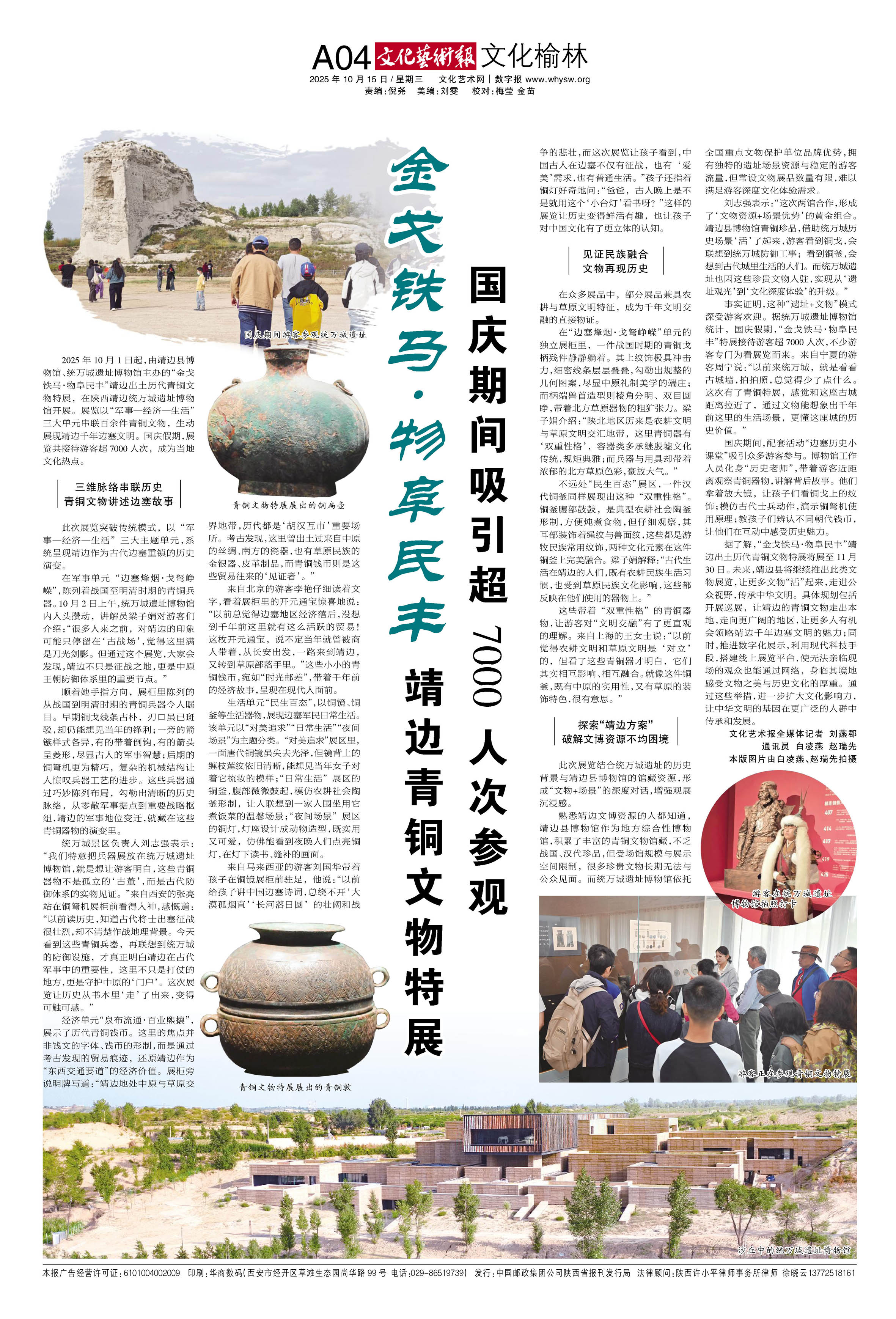 事实证明,这种“遗址+文物”模式深受游客欢迎。据统万城遗址博物馆统计,国庆假期,“金戈铁马·物阜民丰”特展接待游客超7000人次,不少游客专门为看展览而来。来自宁夏的游客周宁说:“以前来统万城,就是看看古城墙,拍拍照,总觉得少了点什么。这次有了青铜特展,感觉和这座古城距离拉近了,通过文物能想象出千年前这里的生活场景,更懂这座城的历史价值。”