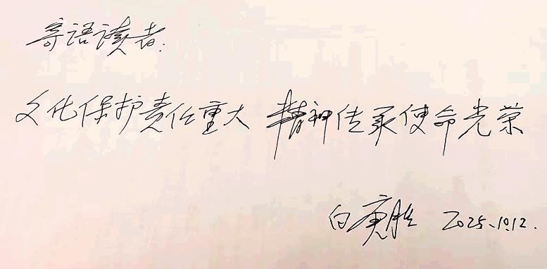 白庚胜:社会上称我为“民族(民间)文化守护神”,我受之有愧,至多只能算一个“保护者”,比我优秀的先贤、前辈、同仁、同时代的人多的是。而且,我所取得的一切,都是祖国、人民、时代给予的,都是中国社会发展到一定阶段的必然产物。当然,在党和国家的领导下,我也不辱使命,做了一定的努力。但是,“群众是真正的英雄,而我们自己则往往是幼稚可笑的。不了解这一点,就不能得到起码的知识”。在博大精深的人民文化面前,尤其是这样。我反对一切“文化造神”,更反对自己“封神”。