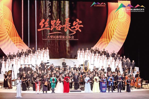 作为开幕演出,大型民族管弦乐《丝路长安》以丝绸之路为主题,分为《梦起长安》《万里跋涉》《五彩绚丽》《平安平安》《丝绸之路》《世界之门》六个章节,通过双胡琴深情对话、多种民族乐器碰撞共鸣、磅礴合唱恢宏压轴,艺术化呈现了丝路文明的交融与传承,奏响了丝路文明互鉴的动人乐章。