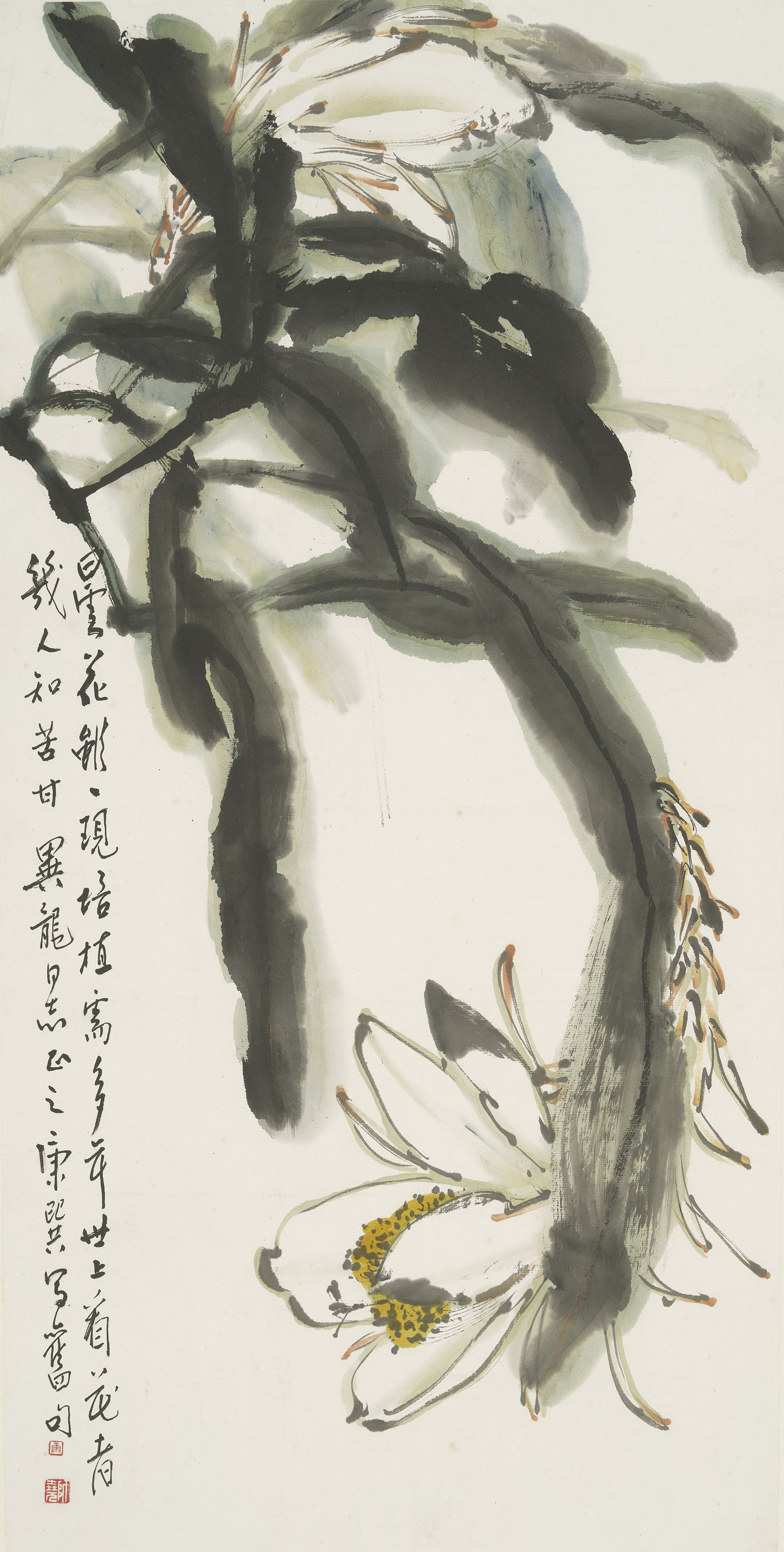 康师尧 《昙花》 纸本设色 68.5cm×34.5cm 约1982年 康师尧(1922—1985),亦名康巽,河南博爱县人,长安画派主要成员之一,中国现当代花鸟画名家,兼善人物、山水。1944年毕业于武昌艺专,1956年任美协西安分会国画研究室主任。生前系中国美术家协会会员,中国书法家协会会员,陕西省美术家协会常务理事,陕西省书法家协会理事,陕西国画院副院长,第三届、第四届全国文代会代表。
