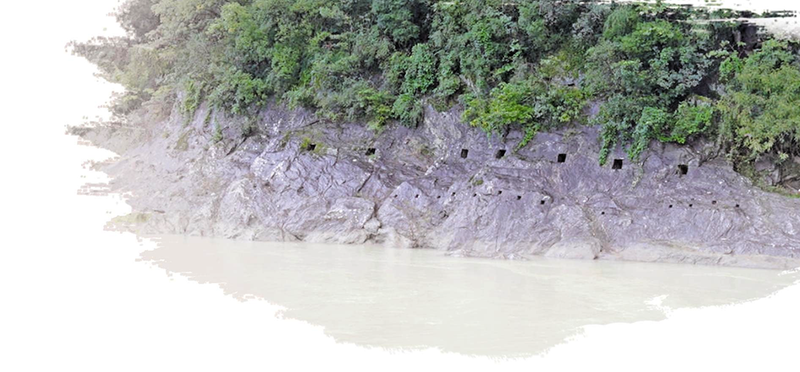 最令人震撼的,是赤崖与武关河的栈道遗址。在赤崖栈道遗址,一个个方形的栈孔整齐排列,虽历经千年风雨,孔壁仍清晰可辨,仿佛昨日才刚刚凿成;陡峭的崖壁上,石阶掩映在丛生的杂草间,沿着崖壁蜿蜒,缝隙里积着薄薄的青苔,抬头望去,仿佛能感受到当年工匠们一锤一凿的艰辛——他们腰系绳索,悬于半空,在坚硬的崖壁上开凿通路,用血汗铺就了这条南北通途。武关河栈道遗址静立在褒河对岸的崖壁上,往日清晰可辨的栈孔,如今正被上涨的河水步步逼近。站在河这边远眺,风里带着水汽的凉意,耳畔是水流撞击岩石的轰鸣,恍惚间竟与千年前工匠们悬于崖壁的场景重叠,而后来的旅行者,亦是每一步都踩着惊险……如今河水渐涨的模样,恰似当年古道上可能遭遇的险况,让这份藏在崖壁里的历史,多了几分可触的厚重与惊心。