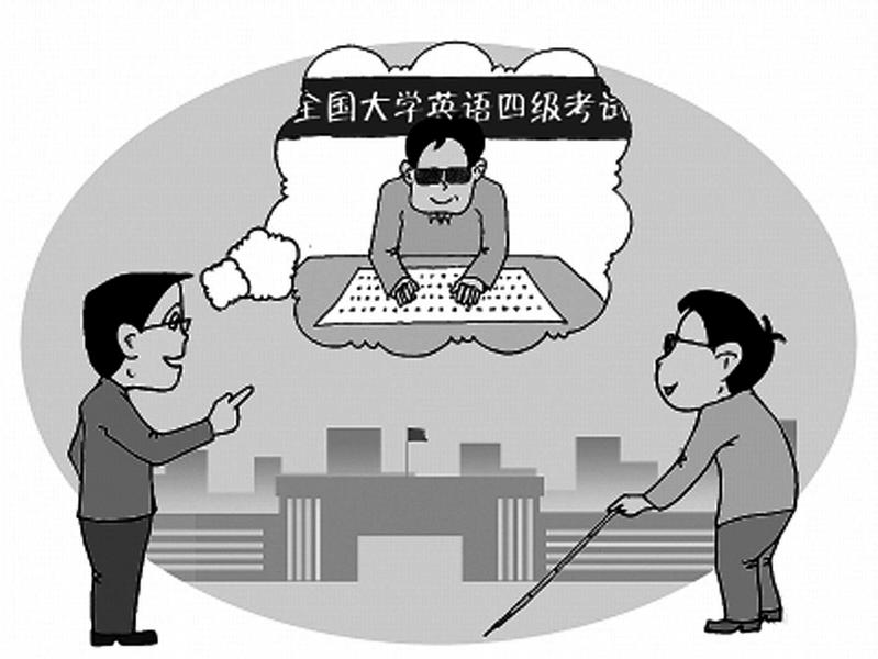 来自教育部考试中心的消息称,在中国残联的大力支持下,2017年6月全国大学英语四级考试为视障人士提供盲文试卷的各项准备工作已经就绪,可以满足盲人考生参加考试的愿望。