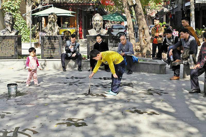如今,西安儿童用毛笔蘸水练习书法。 丁一/摄