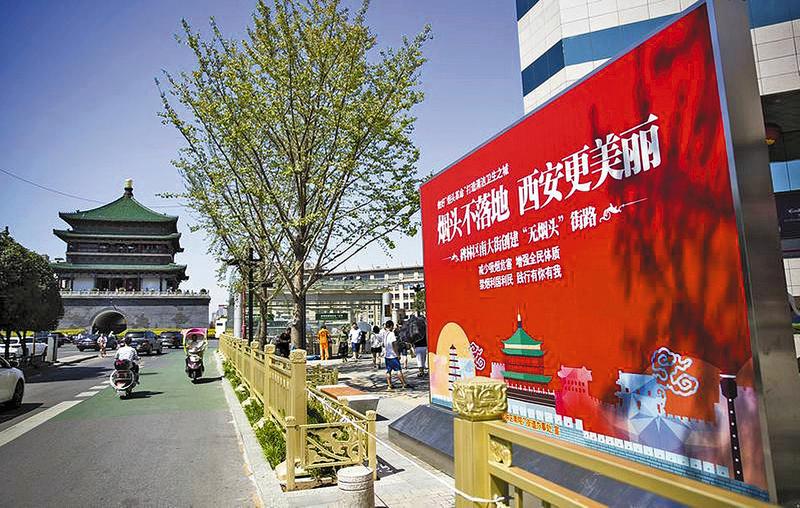 西安广告牌:烟头不落地西安更美丽。2017年1月,西安全市掀起“无烟头”活动。