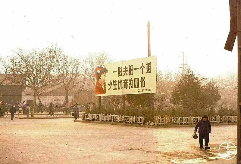 80年代西安街头广告牌:一对夫妇一个娃,少生优育为四化。