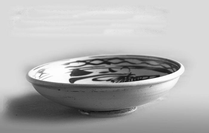 撑盖(仓盖)(清末):高5cm,径20cm。圈足,足较高,施白釉划铁锈花菊花纹图案,器内外均为一福字,内有二道弦纹,菊花纹与福字画法自然流畅,极具美感,喻五谷丰登、福寿常在之意。