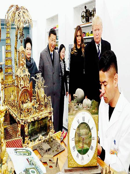 11月8日,国家主席习近平和夫人彭丽媛陪同来华进行国事访问的美国总统特朗普和夫人梅拉尼娅参观故宫博物院。这是两国元首夫妇观看文物修复技艺展示。 新华社记者刘卫兵/摄 应中国国家主席习近平邀请,美国总统特朗普8日下午抵达北京,开启此次中国之行。