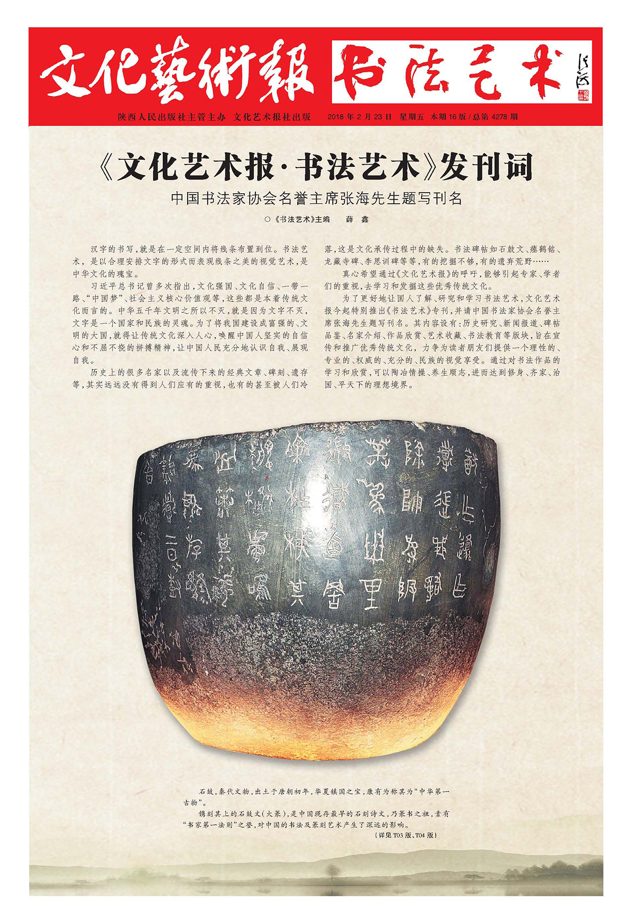 为了更好地让国人了解、研究和学习书法艺术,文化艺术报今起特别推出《书法艺术》专刊,并请中国书法家协会名誉主席张海先生题写刊名。其内容设有:历史研究、新闻报道、碑帖品鉴、名家介绍、作品欣赏、艺术收藏、书法教育等版块,旨在宣传和推广优秀传统文化,力争为读者朋友们提供一个理性的、专业的、权威的、充分的、民族的视觉享受。通过对书法作品的学习和欣赏,可以陶冶情操、养生顺志,进而达到修身、齐家、治国、平天下的理想境界。