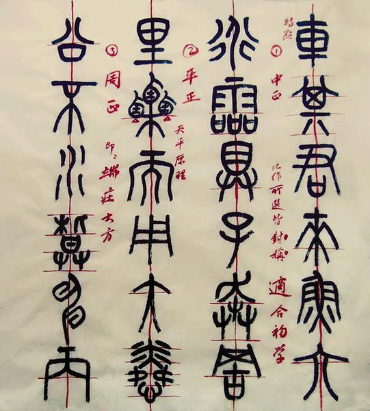 学员作业点评:石鼓文特点内紧外松、圆中见方、张力丰厚、富有弹性,体现了折叉股的特点。习书当由中正、平正、周正处学其结体,进而学习线形质掌握书法技能。
