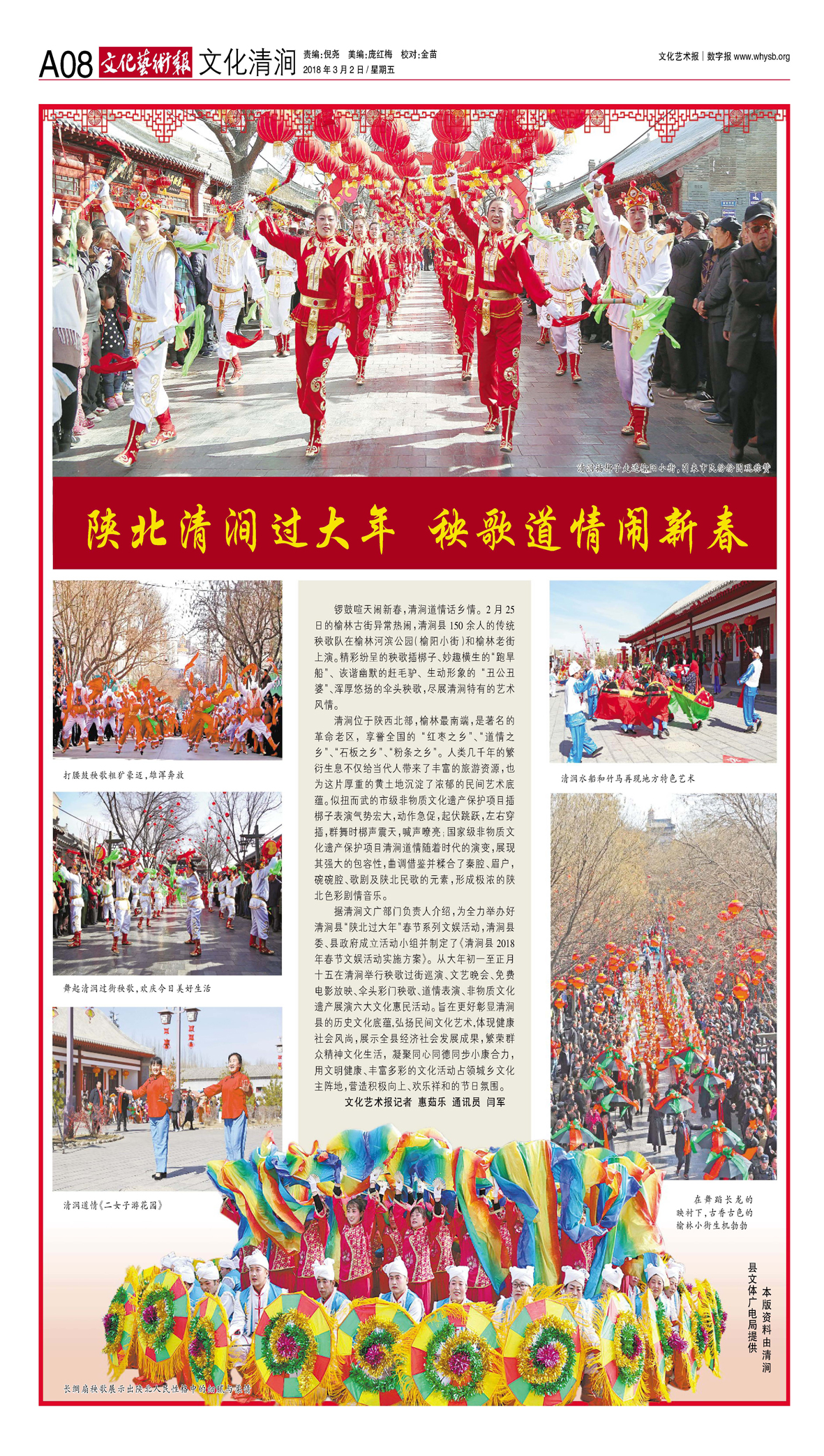 锣鼓喧天闹新春,清涧道情话乡情。2月25日的榆林古街异常热闹,清涧县150余人的传统秧歌队在榆林河滨公园(榆阳小街)和榆林老街上演。精彩纷呈的秧歌插梆子、妙趣横生的“跑旱船”、诙谐幽默的赶毛驴、生动形象的“丑公丑婆”、浑厚悠扬的伞头秧歌,尽展清涧特有的艺术风情。