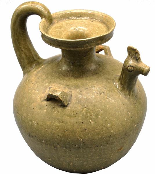 鸡头壶也称鸡首壶,在当时既是实用器,也有部分作为冥器来陪葬,无论用途怎样,鸡头壶是两晋时期越窑的典型代表器物。壶身顶部做一盘口,提手以自然紧握,提拿适度为标准,施以壶把。壶身上部捏塑两个桥拱型系,以鸡首为壶流,壶身圆润饱满,釉色清润如玉,釉色青亮,胎质细腻坚致为香灰色,器物各部件比例恰到好处,整体器型饱满雅致,优美至极。
