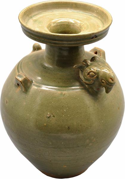 此器物与鸡头壶较之而言,除鸡首换为羊首,其他貌似并无太大差异。其实不然,鸡头壶的鸡首实为壶的流口,羊首尊的羊首只为代表性装饰,并无流口,且由上口注入液体再由原口倒出,瓶身并无流口,也无把手,称之为尊,代表着当时贵胄之士的身份。