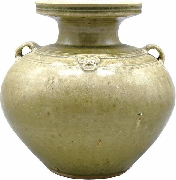 此器物双系之下有印网格纹饰,中间由双辅首链接,辅首纹饰为商周时期青铜器上的饕餮纹饰演变流传,能在晋代器物之上,且器身丰满大气,坚挺有力,想必也必为胄甲之士所用。