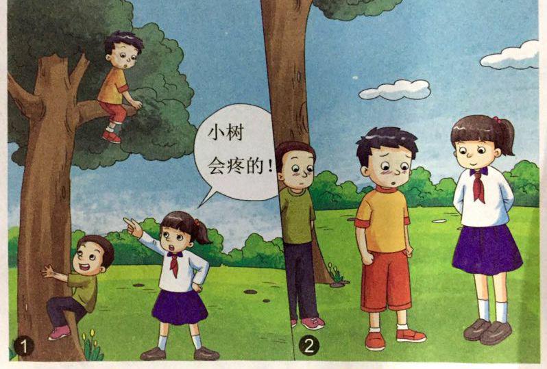 星期天,小明和小军写完作业来到公园里玩。玩着玩着,小明看见一棵郁郁葱葱的大树。“我们比赛爬树吧!”小明提议说。小军立刻点头答应了。于是,小明手脚并用,不一会儿就先爬上了大树,自豪地坐在树干上往下看,开心极了。小军说:“你在上面等我,我一会儿就爬上去了。”只见,小军两手紧抓大树,腿也紧抱着大树,也想往上爬。忽然一位大姐姐跑过来,很严肃地说:“小朋友,你们不能爬树,小树也有生命,你又抓又蹭的小树会疼的,你们快下来吧!”小明和小军听了大姐姐的话,赶紧从树上下来了。小明和小军低头对大姐姐说:记住了,下次再也不这样做了。大姐姐说:“知错就改还是好孩子。你们去别的地方玩吧,千万要注意安全!”