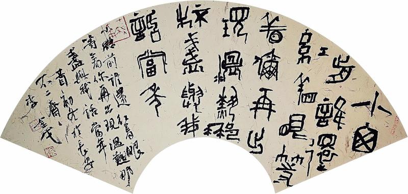 篆书 郭敬明 落落《人间沙》(节录) 初识李金戈,是在五一假期的一次书画雅集上。初次谋面彼此不甚了解,言谈举止中感觉他谦虚沉静,少言寡语,透露着一股朴质豁达之气。待其落笔挥毫之时,泰然处之而挥洒自如,用笔沉实而率意,造型平稳而有画意,呈现一派古拙奇崛的书法意趣,博得了在场书家的啧啧称赞。此次短暂的交流,他给我留下了深刻的印象,后来通过微信不时能欣赏到他的新作,与其虽少于语言上的交流,但我时刻关注着他的动态,感受他创作的激情和艺术的灵感。