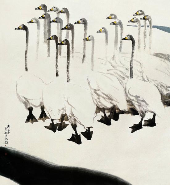 我始终对画家那幅名为《春雷》的作品赞叹不已,这幅画创作于1989年。我国的改革开放的大潮已经隆隆而来,亿万百姓从中看到了莫大的希望,也为贫瘠的社会唤来了福祉,但画家没有直白地去表现这一宏大主题,只用淡淡的墨笔画了一群白鹅,其匠心之处在于所有的白鹅好像听到号令,整齐地引颈张望,既表示了惊讶,又寓意着渴望,深刻把握了那个时期社会的脉搏。而这般诗意的意境,在张之光的画集里比比皆是,任谁阅读也会感觉画家才气逼人矣!