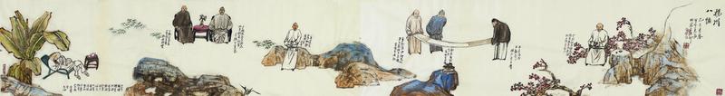 画家笔下的扬州八怪更是修行之状态,一人一图,身形各异,但每个人都表现得恬淡而孤寂,有的独坐案房沉思,有的梅花架下冥想,有的踏步悬崖茫然,有的绕行竹林独步,总之这些人发散着躲进山林成一统的禅意,修行打坐,入定苦思,极想抛却尘世的动荡与荣枯,在山林间成就自己的半亩艺术天地。毫无疑问这般人物本来久已有之,却唯有张之光将八怪刻画得恬淡生动,是把八人隐匿的禅意挖掘出来才有的效果。