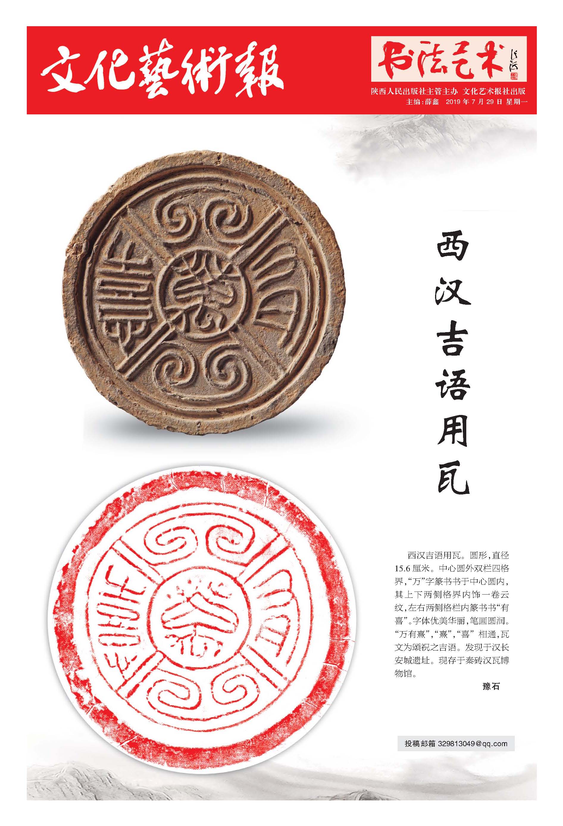 西汉吉语用瓦。圆形,直径15.6厘米。中心圆外双栏四格界,“万”字篆书书于中心圆内,其上下两侧格界内饰一卷云纹,左右两侧格栏内篆书书“有喜”。字体优美华丽,笔画圆润。“万有熹”,“熹”,“喜”相通,瓦文为颂祝之吉语。发现于汉长安城遗址。现存于秦砖汉瓦博物馆。豫石