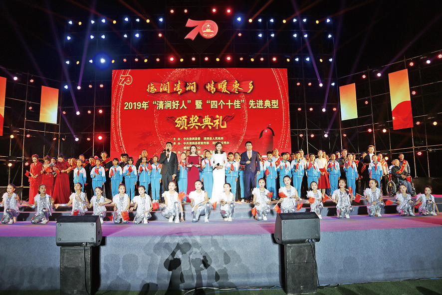 华灯初上夜未央,歌舞笙箫体育场。2019年“清涧好人”暨四个十佳“先进典型”颁奖典礼在开场舞《鼓舞声声》中拉开帷幕,分别为自强致富类、美德善举类、担当奉献类、爱岗敬业类45名个人和十佳村规民约村、十佳红白理事村、十佳美丽乡村、十佳扶贫组织进行表彰颁奖。一个个短片、一首首歌曲、一篇篇朗诵、一个个小品,诠释着中华民族的传统美德,展示着爱心是人性之基,昭示着共产党员的初心和使命,用实际行动诉说着清涧大地的感人故事。