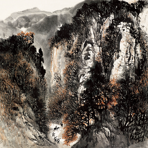 石鲁 《南泥湾途中》 67cm×67cm 1961年 石鲁(1919—1982)原名冯亚珩,四川仁寿人,自幼爱好美术,因崇拜石涛和鲁迅,改名石鲁。1936年毕业于成都美术专科学校。1939年初去延安,曾入陕北公学,后从事革命文艺工作。1944年调陕甘宁边区文协美术工作委员会任创作员。1948年任《群众画报》主编,后调延安大学文艺系任美术班班主任。1949年后,历任西北美协副主任、西北画报社社长,中国画研究院委员、中国美术家协会常务理事、中国美术家协会陕西分会主席、陕西省书法家协会主席、陕西国画院首任名誉院长等。