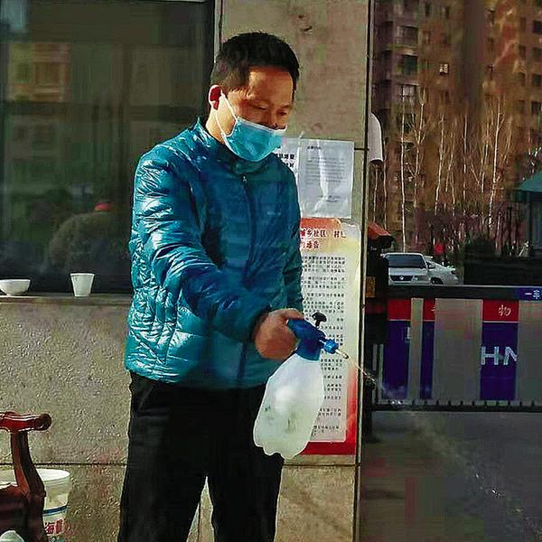 “我先给员工们做工作,最危险的活儿、大家不想干的活儿,我出面解决。例如帮助隔离户买米买菜、处理日常生活垃圾、送酒精、采购生活用品,我干。我都不怕,你们还怕啥?大年三十,我看了电视新闻后立即赶到超市买了两箱84消毒液,初二还想再去买,就买不到了。我背着药桶连夜在隔离户房前屋后、电梯楼道消毒三次。有一户隔离户需要酒精,但社区搞不下,我从家里拿了一瓶放到他家门口。我给隔离户挨家挨户打电话,挨家挨户敲门,‘你们把垃圾放到门口,需要买啥就打我电话’。有一户过年电视看不成,没有网,我就给社区打电话,联系客服,找维修工,大家群策群力,想办法给他接网线,保证叫他能看电视。业主感到很高兴,很感激我。我更感谢他们,因为他们不出门,就是对社区做贡献了。你说对吧?”