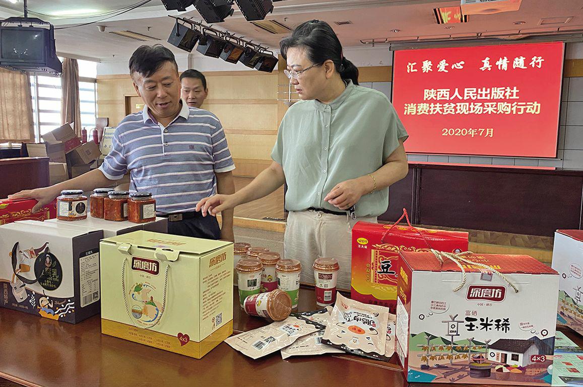 陕西新华出版传媒集团党委委员、陕西人民出版社总编辑宋亚萍(左二)选购扶贫产品 刘雯/摄