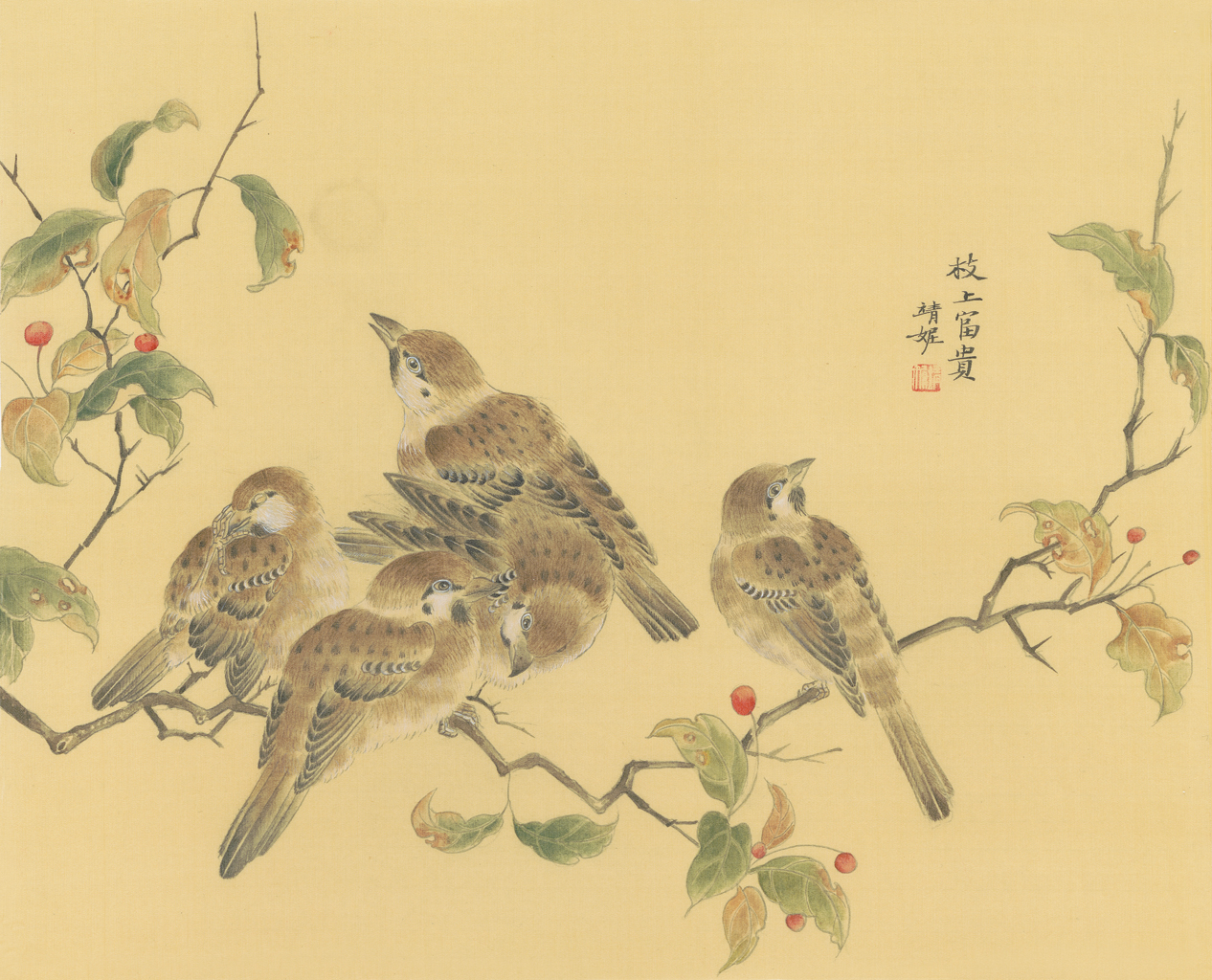 画为心声。“陈桥兵变”导致右文抑武成为宋代之基本国策,更为士大夫、文人雅士提供了政治特权。宋代文人因其精神上的自由,使宋代的诗词、文章、书法、绘画都洋溢着天真烂漫、自由洒脱、雄浑辽阔的意蕴之气,他们注重通过绘画中景物来表达自己的心意、处境。范靖妮的作品亦是如此,心境不为外物所牵,足以抵挡时流的诱惑。她把自己对人生的感悟、对艺术的执着深深寄情于自己笔下的一笔一墨,一花一鸟。