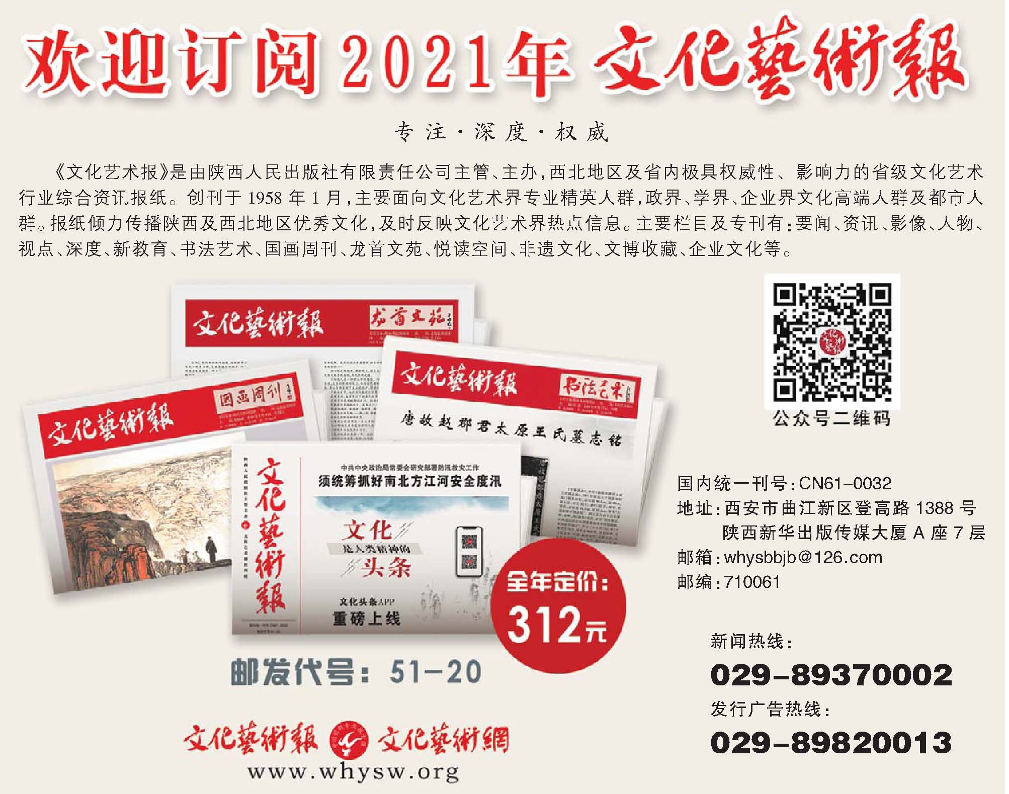 《文化艺术报》是由陕西人民出版社有限责任公司主管、主办,西北地区及省内极具权威性、影响力的省级文化艺术行业综合资讯报纸。创刊于1958年1月1日,主要面向文化艺术界专业精英人群,政界、学界、企业界文化高端人群及都市人群。报纸倾力传播陕西及西北地区优秀文化,及时反映文化艺术界热点信息。主要栏目及专刊有:要闻、资讯、影像、人物、视点、深度、新教育、书法艺术、国画周刊、龙首文苑、悦读空间、非遗文化、文博收藏、企业文化等。