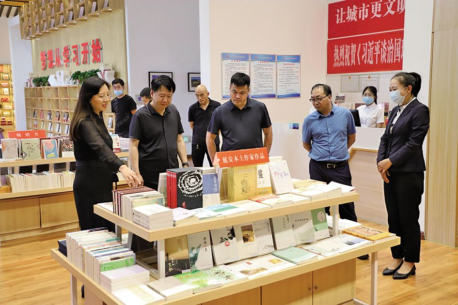 陕西人民出版社党委副书记、副总经理赵小峰(前排右三)一行调研延安书局阅读空间
