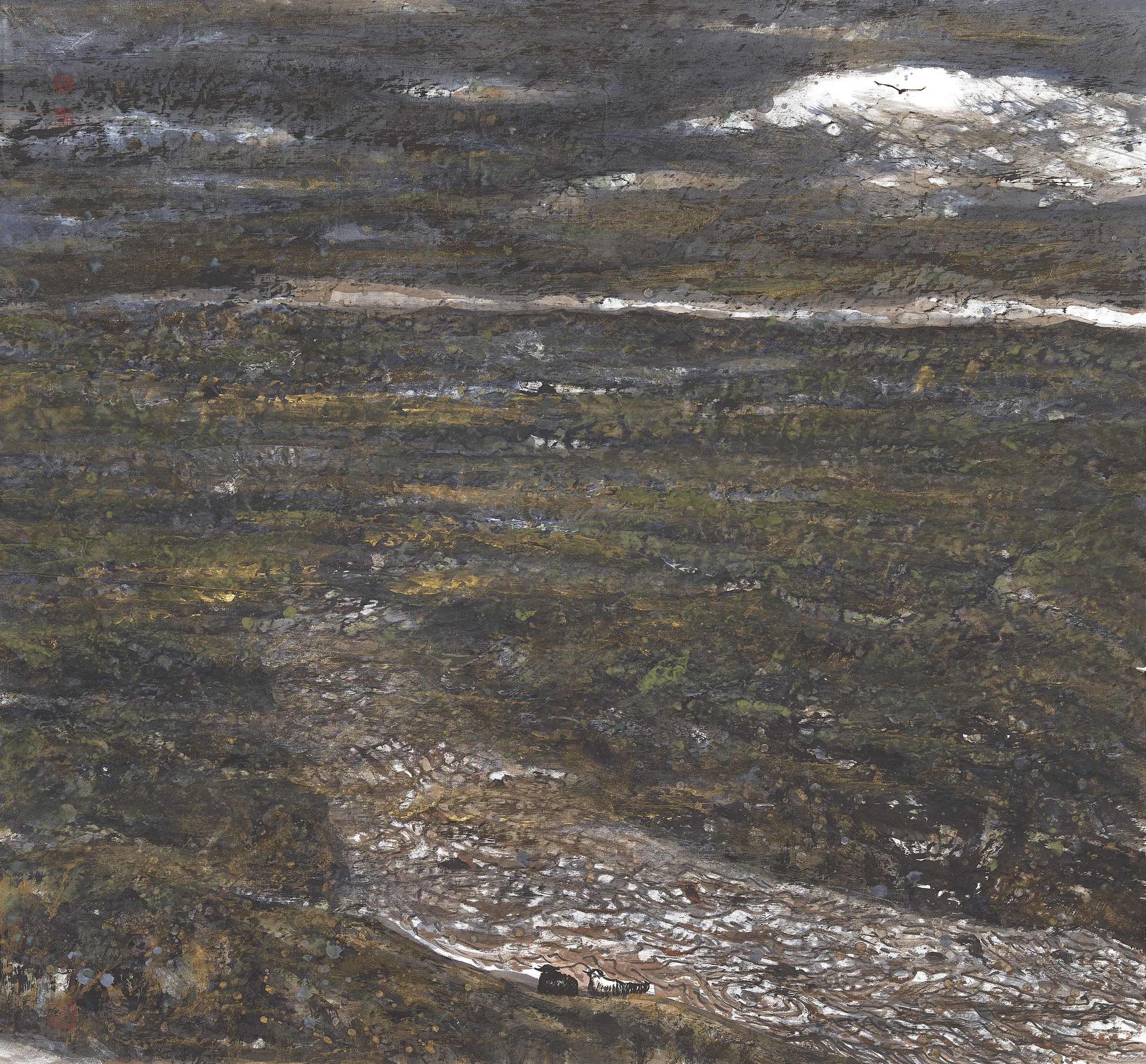 赵雪伟 《圣域之三》 纸本设色 90cm×90cm 2021年 要写雪伟总想不起是山水画家雪伟,而是我的好友兼球友雪伟。雪伟是一个极认真又负责任的人,打球也不例外。我和罗宁、雪伟时常约球,观战罗宁、雪伟打球,是很令人开心的事,在罗宁“扣!扣!”的叫板声中,雪伟认真地一板一板扣杀,两人来来回回,让观者不断叫好。