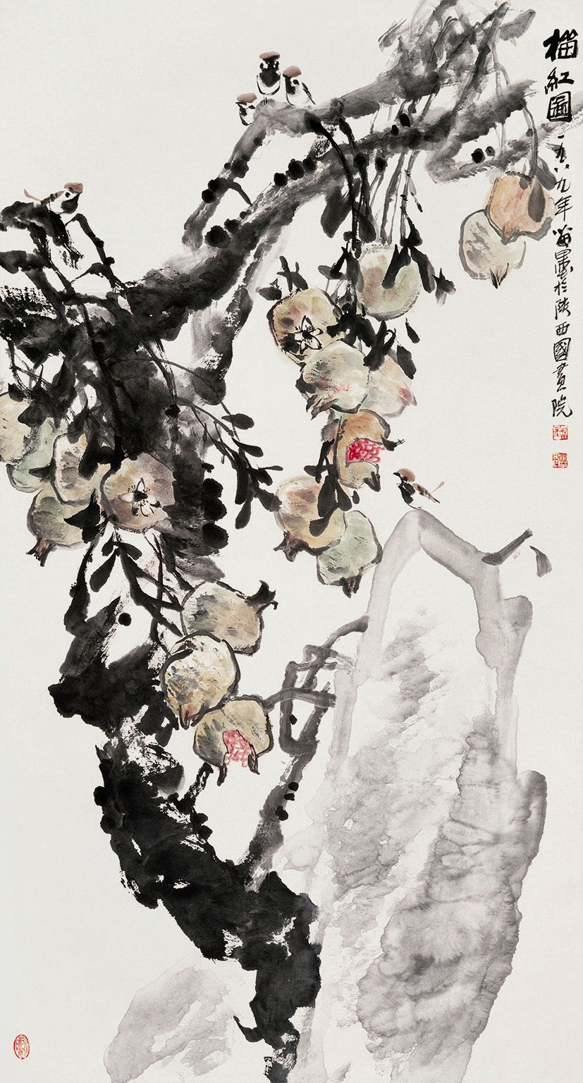 苗墨 《榴红图》 纸本设色 178cm×96cm 1989年