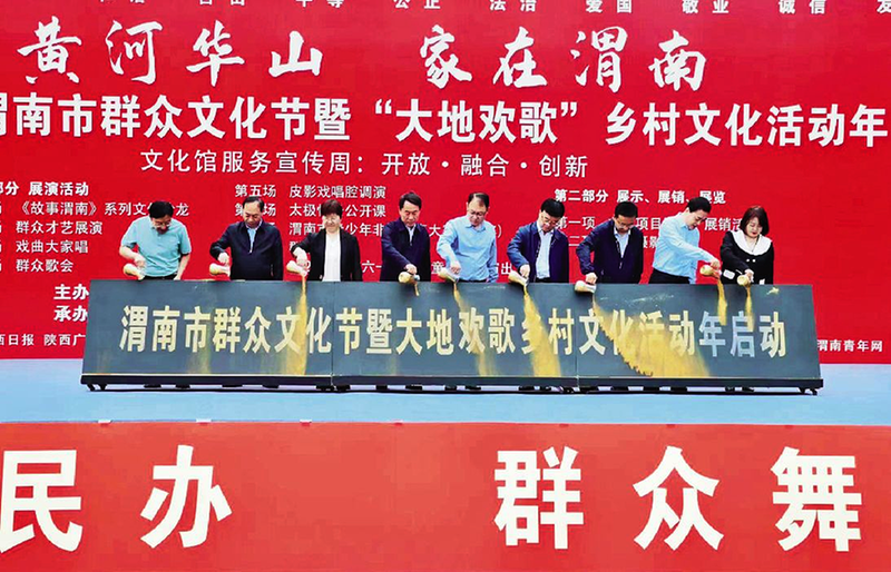 “黄河华山家在渭南”2023年渭南市群众文化节启动仪式现场 文化艺术报讯(全媒体记者 高盼成 张颖)5月23日上午,由渭南市委文明办、渭南市文化和旅游局主办,渭南市文化艺术中心、渭南市非物质文化遗产保护中心、文化艺术报社承办的“黄河华山 家在渭南”渭南市群众文化节暨“大地欢歌”乡村文化活动年在渭南中心广场启动。