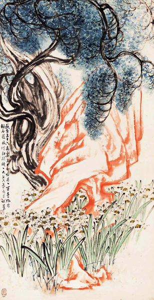 康师尧 《柏石图》纸本设色 133cm×68cm 1976 年 “时代长安——陕西当代中国花鸟画研究展”是贯彻学习习近平文化思想与习近平历次来陕重要讲话重要指示精神的一次重要文化举措,是进一步坚定文化自信、弘扬中国优秀传统文化的具体实践,是对陕西文化艺术丰富宝贵资源的一次深度挖掘与高度弘扬,是讲好陕西故事、推动陕西文化强省建设的一次有意义、有价值的文化艺术活动,也是当前文艺界践行习近平总书记在文艺工作座谈会上的讲话精神,坚持以人民为中心的创作立场,培根铸魂、守正创新的文化实践。
