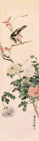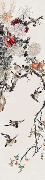 叶访樵 《秋菊群雀图》纸本设色 144cm×36cm 50年代