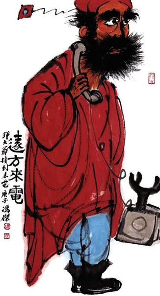 社会行情上,钟馗造像一直属于“显画”,不是“冷画”。这就需要让人思索了。画钟馗永远不俗,市场热门畅销。画家会死,钟馗不死,朱砂红不死,估计还能画五百年。上至中南海下至隔壁豆腐坊及对门烧饼店,都可张贴使用。功能是避邪,大吉。