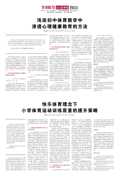 [3]谢冰卿.快乐体育理念下小学体育运动训练质量的提升策略[J].当代体育科技,2024,14(15):183-186.