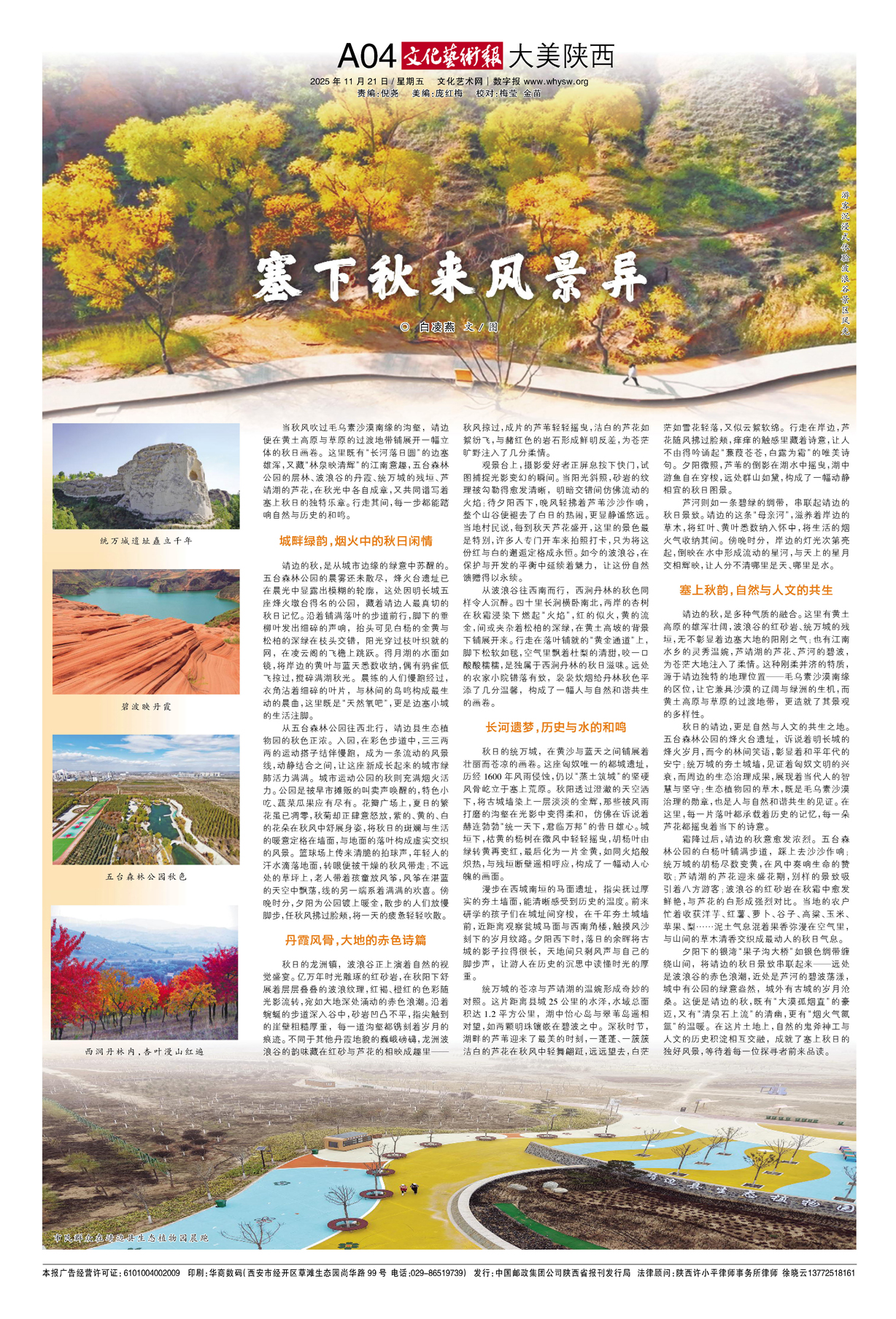 秋日的靖边,更是自然与人文的共生之地。五台森林公园的烽火台遗址,诉说着明长城的烽火岁月,而今的林间笑语,彰显着和平年代的安宁;统万城的夯土城墙,见证着匈奴文明的兴衰,而周边的生态治理成果,展现着当代人的智慧与坚守;生态植物园的草木,既是毛乌素沙漠治理的勋章,也是人与自然和谐共生的见证。在这里,每一片落叶都承载着历史的记忆,每一朵芦花都摇曳着当下的诗意。