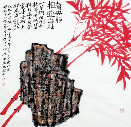 三十年里,我画过许多株红竹子,它们饱吸朱砂,枝叶通红。朱砂的根须长在宣纸上,纸背泻丹,几近冬天烧炕。前天,有一位号称“全县第一”的美女看到我画一张红竹子,砍价要订,微信里问,你为啥把竹子画成红色的还命名红竹子?