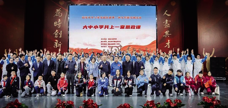 大中小学学生代表、思政课教师代表与领导嘉宾合影 西安市教育局供图 文化艺术报讯(见习记者 王转)12月16日下午,“西安市中小学党团队教育一体化创新实践活动”全市大中小学共上一堂思政课在西安高新第一中学南校区钱学森生平业绩展馆及报告厅开讲。全市各区县、开发区选派的700余名大中小学学生代表、思政课教师代表等参加活动。